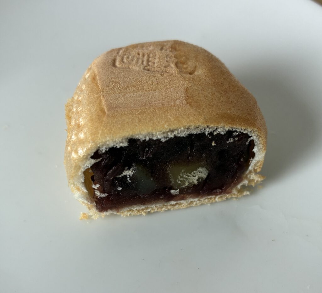 半分に割ると クラッシュ栗がゴロッと入り、小倉あんの中で良いアクセントになっています。
